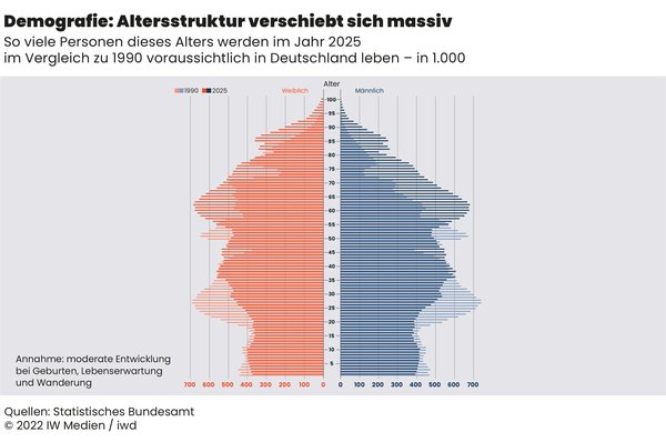 Bereits 2025 wird die Altersverteilung der deutschen Bevölkerung weit von der klassischen Pyramidenform entfernt sein – die meisten Einwohnerinnen und Einwohner haben dann gerade das Rentenalter erreicht oder stehen kurz davor.